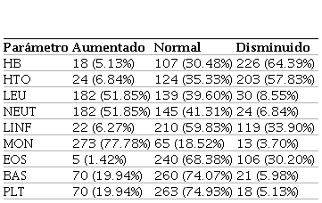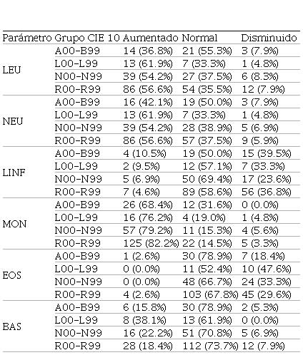 Results: Of the 718 patients who reached the PER, 351 met the inclusion criteria. With an age of 5 ± 5 years, 52.9% were girls. The age group with the highest frequency was early childhood (0 - 5 years) with 63.3%. The most frequent diagnoses were those associated with symptoms, signs and abnormal clinical and laboratory findings, not classified elsewhere (R00-R99) with 43.3%. The parameters that were most frequently decreased in the CBC were HB (64.39%) and% HTO (57.83%), the one that most frequently increased was Monocytes 77.78%. The MON, LEU and NEU, for the group of Certain infectious and parasitic diseases (A00-B99).