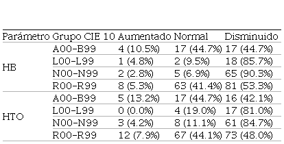 Más del 80 % de los pacientes que llegaron a la PER, con diagnósticos para las Enfermedades del sistema respiratorio (J00-J99) . Enfermedades de la piel y el tejido subcutáneo (L00-L99) . Enfermedades del aparato genitourinario (N00-N99) tuvieron la particularidad de presentar disminuidos los parámetros de Hb y Hto, aunque para los grupos de Ciertas enfermedades infecciosas y parasitarias (A00-B99) y Síntomas, signos y hallazgos anormales clínicos y de laboratorio, no clasificados en otra parte (R00-R99), también presentaron disminuidos estos parámetros, no fue tan marcada como en las patologías inicialmente mencionadas (Tabla 3).