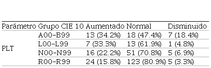 Las patologías L00-L99, N00-N99 y R00-R99 tuvieron más del 60% de los pacientes con los valores para las PLT dentro de los rangos esperados tanto para su rango etáreo. Los pacientes con patologías A00-B99 fueron las que presentaron una frecuencia algo elevada para este parámetro, solo el 34.2% lo tenían elevado (Tabla 5).