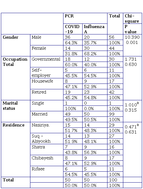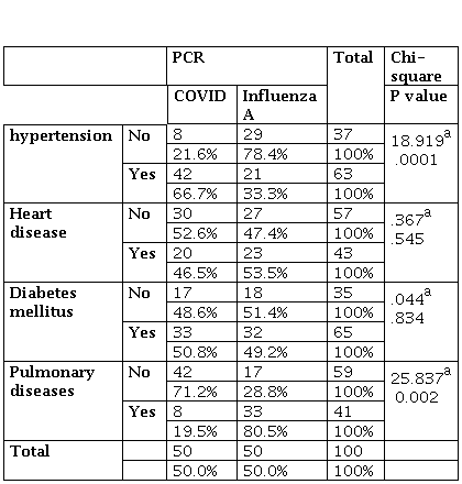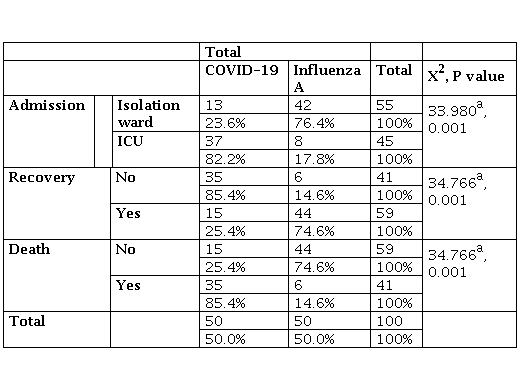 Study population: The participators constituted patients looking for medical facilities in isolation departments of AL-Hussein teaching hospital in Al-Nasiriya city, the diagnosis was assured by any feasible details in the case sheets of patients, whole numbers of patients accounted for in the analysis was 100 patients, with 50 cases affirmed to be COVID-19 pneumonia and 50 candidate verified to be influenza A pneumonia elected as control.
