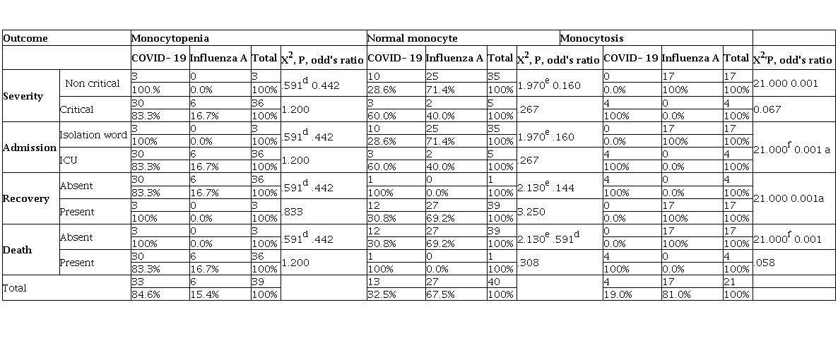 In our analysis, we are approaching substantive perceptions: two-thirds of COVID-19 presented with reduced monocytes count, and the bulk of influenza A participators have had more elevated monocytes than counterpart COVID-19 with significant statistical difference implying that monocyte is a vigorous diagnostic indicant that is useful for discrimination, we are nearly in line with Chen et al.16. Monocytes were much lower in passed away COVID-19 participators than those who remained alive with significant difference between fatality and recovery patients according to monocytes (P value: 0.001), and monocytes were anticipant for death in COVID-19 by 20 folds (Odd ratio=1.200). Our study determinations are concordant with Pakos et al.17 that perceive dead persons had lower monocytes and had an inverse relation with fatality. Our study 30 monocytopenic who were critically ill with COVID-19 died (P value=0.0001), concluding that monocytopenia is intimately interrelated with lethality in critically COVID-19. A study done by Blomme et al.18 extrapolating that passed away patients with COVID-19 had lower monocytes than alive patients. Our analysis's Pivotal determination is that monocytes are lower in critical than non-critical grouping and it anticipating severity by 17 folds (Odd ratio=1.200) and anticipates admittance to ICU (odd ratio=1.200), a recent meta-analysis by Bao et al.19 surmised that monocytes is much reduced in severely affected clients. In contrast to our study, Bastug et al. 20 did not set up dissimilarity between critical and non-critical patients in regard to monocytes in COVID-19, this is owing to the fact that there might be a difference in study population or design of the study. But Anurag et al.21 declare comparable findings to our discernment in that monocytes discordantly reciprocating with severity. Peculiarly bulk of recovered patients 12 out of 13 with COVID-19 had normal monocytes count. Two out of three of critical normomonocytic clients were saved, substantiate impactful evidence that normalizing monocytes at any grade of severity might harbinger the onset of recovery. Fathi et al.22 ascertained that COVID-19 patients had appreciably higher monocytes sooner in recovered patients with COVID-19. Strikingly all critically ill patients in the COVID-19 grouping who undergone admittance to ICU with monocytosis died with high statistical significance disclosing that monocytosis is an expectant for lethality and most facets of dreadful terminal events of COVID-19. Mei et al.23 revealed the hospitalized patients with COVID-19 exhibiting monocytosis in the midst of other laboratory variables go through all spans of unfavorable terminal events with exposing the worse prognostication properties. Looking at a bio-demographic trait of our analysis, cases, and control were in a nearly exact fitting situation to elude from selection bias, so most traits displayed no significant statistical relation. Come to comorbidities in our study; COVID-19 grouping demonstrates a sizable number of underlying pre-existing conditions, hypertension was the dominating then diabetes mellitus, heart disease and the slightest is pulmonary illnesses, our discerning in agreement with Guan et al.24. There is significant statistical interrelation joining cases and control regarding hypertension and pulmonary disorders where P values=0.001 and 0.002 respectively in accordance with Shen et al.25, but there was no significant interrelation regarding diabetes and cardiac diseases where P values=0.834, 0.545, respectively, this is nearly compatible with what was attained by virtue of Zayet et al. 26