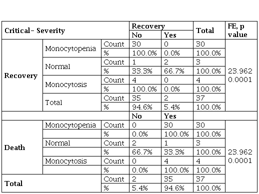 37 participators with COVID-19 were critically ill, 35 died and 2 recovered, 30 dead were monocytopenic, 1 was normomonocytic whilst 4 have had monocytosis, 2 who were recovered were normomonocytic with significant statistical significance where P value=0.0001 for both death and recovery in critical patients in relation to monocytes count as exhibited in table 5.