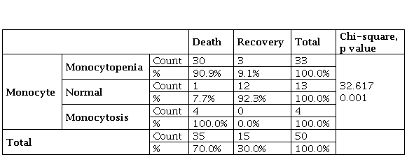 Of 33 COVID-19 participators, 30 people with COVID-19 who were monocytopenic died, 4 with monocytosis died whilst just 1 normomonocytic died, 12 with normomonocytic recovered, whilst no participator with monocytosis recovered, with significant statistical significance between recovery and death where (P value =0.001) for both as displayed in table 6.