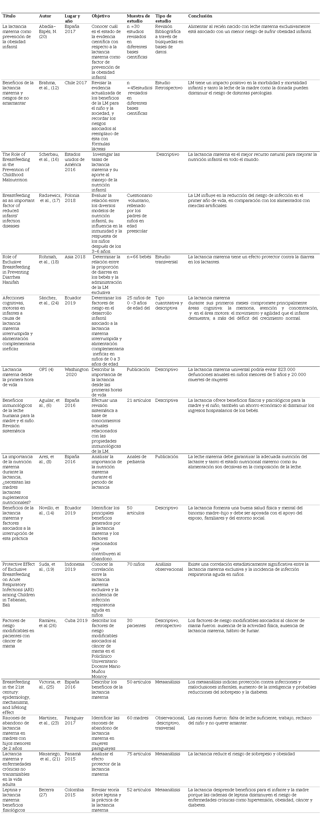 En la publicación Lactancia materna como método para prevenir alteraciones cardiovasculares en la madre y el niño15 menciona que el abandono precoz de la lactancia materna es un problema que afecta a las madres y a los niños, y es debido a la falta de apoyo, uso del chupete y administración de leche de fórmula, al dolor de pezones y el temor a no tener suficiente leche para mantener al bebé. En el tema “The role of breastfeeding in the prevention of Chilhood malnutrition”16 refiere que la lactancia materna tiene un papel importante en la prevención de diferentes formas de desnutrición infantil, incluidas las deficiencias de desgaste, retraso del crecimiento, sobrepeso - bajo peso y micronutrientes debido a su composición única que la convierte en un medio efectivo para prevenir las alteraciones de salud.