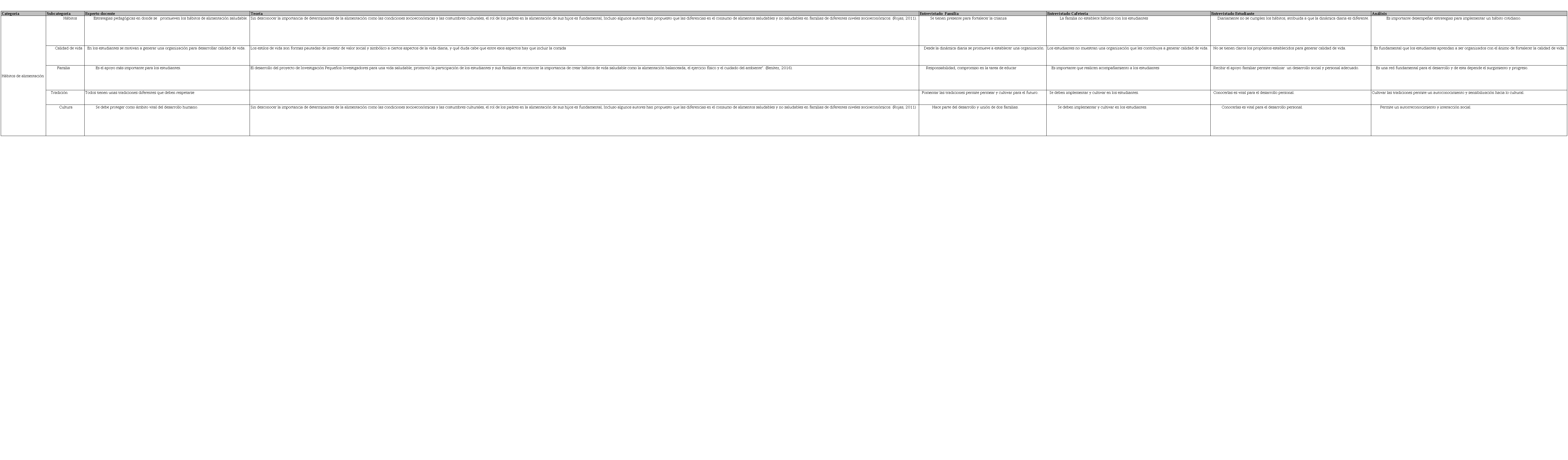Resumen: En el marco legal de la UNICEF, la Ley Orgánica para la Protección del Niño, Niña y Adolescente, hace referencia a los derechos de ellos en aspectos de información, atención en salud y nutrición. La formación de hábitos alimentarios y estilos de vida saludable conforman un área prioritaria. El artículo tiene por objetivo analizar los hábitos de alimentación en estudiantes a través de un grupo focal y por medio de entrevistas a padres de familia, administrativos y directivos, desde un enfoque cualitativo. El análisis fue realizado en Excel y Atlas-Ti, desde la matriz de categorización e igualmente la matriz de triangulación de la información recolectada. Se concluye que es fundamental proponer y orientar una alimentación adecuada desde la infancia para prevenir enfermedades, desórdenes de alimentación, desnutrición, sobrepeso e incluso la muerte, y es responsabilidad de la familia e institución velar y garantizar estas condiciones.