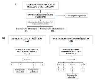 Las plantas libres de algún tipo de enfermedad fueron lavadas bajo un flujo constante de agua. Posteriormente fueron secadas al aire libre y todas las partes de la planta a excepción de la raíz fueron trituradas hasta obtener un polvo fino. Usando 500 g del polvo obtenido se realizó una extracción inicial por 72 horas con etanol al 96% obteniendo un extracto etanólico de Callistemon speciosus (CSEE) que fue concentrado con el uso de un rotavapor a 40°C. El extracto obtenido fue sometido a una subextracción, por separación de fases utilizando un embudo de separación, siguiendo el esquema de la figura 1 (a). Así, se realizó una extracción Etanol:Clorofomo (1:1) obteniendo los subextractos A y B. Los extractos obtenidos fueron conservados a 5°C hasta posteriores análisis. Los rendimientos obtenidos para el extracto etanólico y los subextractos etanólico y clorofórmico fueron de 2,61%, 1,49% y 0,99%, respectivamente.