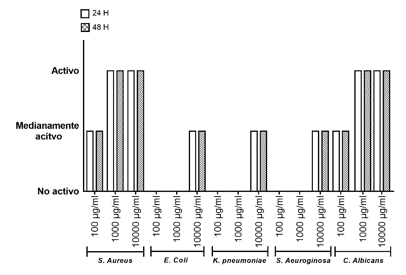 Durante la observación de las placas después de 24 y 48 horas se determinó que el extracto etanólico a la concentración de 10000 µg/mL demostró actividad para S. aureus y C. albicans, y actividad parcial para E. coli, K. pneumoniae y P. aeruginosa. Mientras que a una concentración de 1000 µg/mL solo presenta actividad frente a C. albicans y S. aureus, y finalmente a una concentración de 100 µg/mL es parcialmente activo para S. aureus (figura 3).
