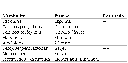 El análisis preliminar del extracto etanólico mostró la presencia de saponinas, taninos, flavonoides, alcaloides, sesquiterpenolactonas, triterpenos y esteriodes.
