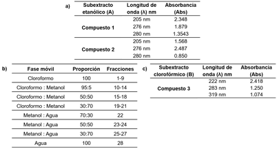 Posteriormente se procedió a la separación de los metabolitos presentes en los extractos obtenidos (figura 1b), para lo cual, en el caso del extracto clorofórmico, usando cromatografía en columna con sílica gel (SiO2-H2O) como adsorbente y cloroformo, acetato de etilo, metanol y agua como eluyentes, se recogieron aproximadamente 3 mL por cada fracción. A continuación, usando cromatografía de capa fina (TLC) se realizó la detección de posibles metabolitos aislados en cada fracción. Se utilizó un sistema de adsorbente y eluyente igual que en la cromatografía en columna usando como revelador a la vainillina. En el caso del subextracto etanólico se realizó una separación por placa preparativa para aislar posibles metabolitos secundarios.