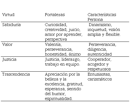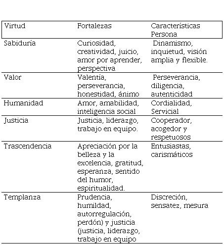 Todas estas virtudes, las fortalezas asociadas y las características de la persona se resumen en la Tabla 1.