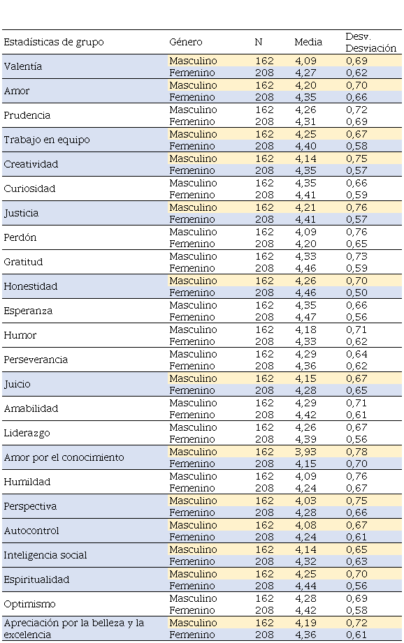 Cuando se evaluan los resultados de las 24 fortalezas de carácter por género (Tabla 2) se puede observar que los puntajes de las mujeres tienen menos variación en sus respuestas y su promedio está más cercano al puntaje máximo de la fortaleza que es 5,0. Eso demuestra que hay más tendencia en las mujeres al aprecio por la belleza y la excelencia, lo que significa percibir y apreciar la belleza visual, auditiva, táctil, o abstracto, lo que quiere decir que provoca asombro y maravilla de lo que le rodea, como también de habilidades o talentos, llevándole a sentir admiración (44). Se habla también de una belleza moral, un impulso para ser mejor, produciendo sentimientos de elevación, también se puede deducir que en las mujeres también hay una tendencia más alta en la fortaleza valentía, que muestra un pensamiento de desafío, de no amedrentarse ante la amenaza y persistir ante el dolor.