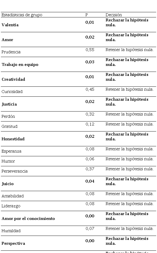 Al aplicar la prueba no paramétrica de la U de Mann-Whitney para evaluar las diferencias estadísticas entre el género femenino y masculino (Tabla 3), se puede observar que se acepta la hipótesis de trabajo frente a la diferencia en el género en las fortalezas: valentía, amor, trabajo en equipo, creatividad, justicia, honestidad, juicio, amor por el conocimiento, perspectiva, autocontrol, inteligencia social, espiritualidad y aprecio por la belleza y la excelencia, es decir se presenta una diferencias estadísticamente significativa entre genero en la fortalezas mencionadas.
