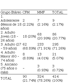 Los rangos etáreos de mayor frecuencia fueron adulto (27-59 años) con 295 pacientes (71,26%) y adulto joven (18 – 26 años) con 86 (20,77%). La edad promedio para los hombres fue 38±13 años y para las mujeres 37±13 años, sin encontrarse diferencia significativa para la edad (p=0,5817).