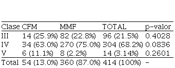 Las clases membrano-proliferativa (Clase III y IV) representaron el 89,7% de las biopsias. Aunque la Clase V el esquema de mayor representatividad fue con CFM (11,1%) con respecto al esquema con MMF (2,2%), no se observó una diferencia al comparar directamente los valores porcentuales; sin embargo, al evaluar la tendencia global mediante un χ², se observó que existe una tendencia marcada a tratar la clase membranosa (Clase V) con CFM que con MMF (χ²: 12.098; p=0,002353).