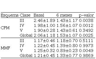 El promedio global de la CrSr de los pacientes tratados con CFM fue de 2.06±1.18. Se encontró que la CFM tuvo una respuesta significativa en las clases III y IV, con un delta de 1.03±0.72 para la Clase III y de 0.42±0.07 la clase IV, y aunque no se observó un delta significativo para la clase V, se observó una disminución del parámetro (mejoría). A nivel global se observó un marcado descenso de la CrSr (p=0,0025), evidenciando la acción de la CFM en la mejoría para este parámetro (Tabla 4).