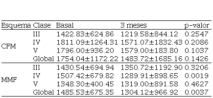 En cuanto a la Prot24hrs (Tabla 5), se observó que a la CFM no fue eficaz en el manejo de este parámetro, aunque si se observó una tendencia a la disminución en todas las clases histopatológicas, esta no fue estadísticamente significativa (0,1426).