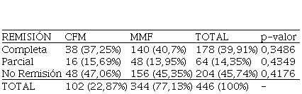 La tasa de respuesta (Remisión Completa o Parcial) fue para CFM del 52,94% y para 54,65%, sin diferencia entre los esquemas de tratamientos para la Inducción a la Remisión (p=0,4122). Así mismo, ambos esquemas tuvieron la misma proporción en cuanto a Respuesta Completa (p= 0,3486) y Parcial (p=0,4349) (Tabla 6).