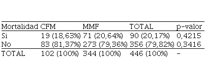 La mortalidad global fue del 20,17%. No se encontró diferencia entre los esquemas de tratamiento, ambos tuvieron igual representación porcentual en cuanto a mortalidad (p= 0,4215), aunque e observó un leve aumento de esta en el esquema con MMF, sin ser estadísticamente significativo (Tabla 7).