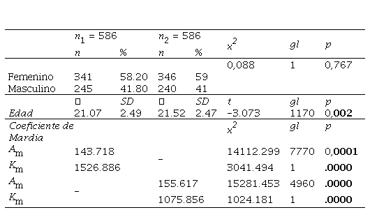 Las dos submuestras del procedimiento de validación cruzada no presentaron diferencias significativas en función del género, pero sí de la edad. Las pruebas de normalidad multivariante de Mardia indican la ausencia de normalidad en las variables observadas para ambas submuestras (Tabla 1).