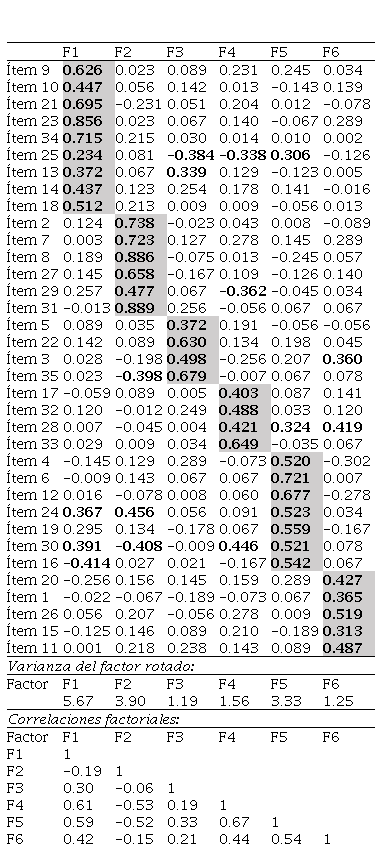 Nota. En negrita: cargas factoriales >0.30 en valor absoluto. Sombreado: factor agrupado teóricamente.