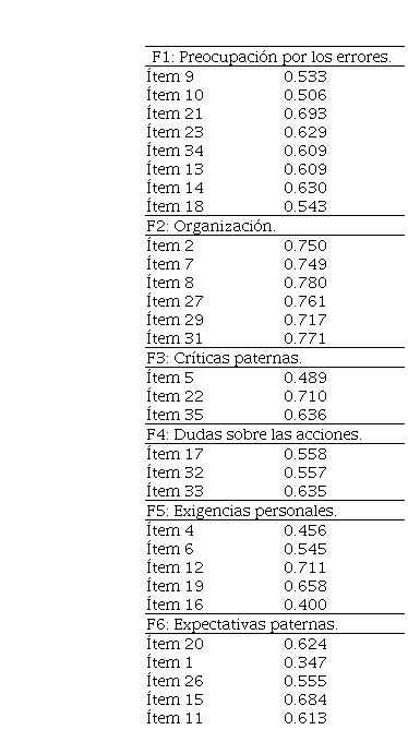 Con la primera submuestra (n1 =586) se llevó a cabo la extracción de factores con el método PA de rotación promin y para la conformación de los factores se consideraron los criterios de: 1) valor propio superior a uno, 2) carga factorial mayor a 0,30, 3) congruencia teórica entre los reactivos de un factor, y 4) más de tres reactivos agrupados en un factor. Los datos de la matriz de correlaciones resultaron adecuados para este tipo de análisis [prueba de esfericidad de Bartlett (595) =9253,0; p < 0,0005; Índice Kaiser-Meyer-Olkin=0,941]. Se extrajeron seis factores, de acuerdo con la regla de autovalores mayores a uno. Esta solución explicó el 59,02% de la varianza. Al analizar los factores obtenidos se encontró que los reactivos agrupados en los seis factores mostraron congruencia conceptual, excepto los ítems: 3, 24, 25, 28 y 30 que saturaron con cargas bajas en más de un factor, y no a lo esperado teóricamente, debido a este motivo fueron depurados; esta decisión fue apoyada por la estructura obtenida en el Scree test, ya que también indicó la congruencia de los seis factores. En la Tabla 2 se recogen las saturaciones de la matriz de configuración rotada: el primer factor estaría formado por ocho ítems relacionados a la preocupación por los errores; el segundo agruparía seis ítems relacionados a la organización; el tercero estaría formado por tres ítems relacionados a las críticas paternas; el cuarto estaría agrupado por tres ítems, relacionados a las dudas sobre las acciones; el quinto estaría agrupado por cinco ítems relacionados a las exigencias personales; y el sexto factor estaría formado por cinco ítems relacionados a las expectativas paternas.