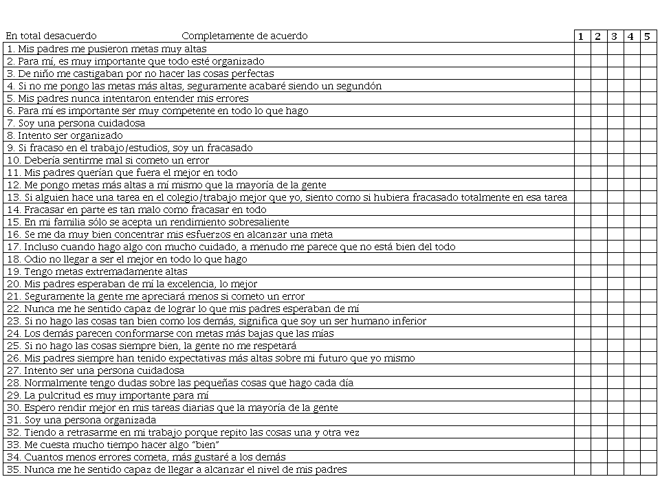 Multidimensional Perfectionism Scale1. Instrumento de medida del perfeccionismo, conformado por un cuestionario autoaplicado de 35 ítems medidos por una escala tipo Likert de cinco opciones de respuesta, que van desde 1 “totalmente en desacuerdo” hasta 5 “totalmente de acuerdo”. En cuanto a su composición interna y fiabilidad, el cuestionario está conformado por seis dimensiones que explican el 53,60% de la varianza: Exigencias personales Personal Standards (α=0,83), Preocupación por los errores Concern over Mistakes (α=0,88), Dudas sobre acciones Doubts about Actions (α=0,77), Expectativas paternas Parental Expectations (α=0,84), Críticas paternas Parental Criticism (α=0,84), y Organización Organization (α=0,93). Posee una adecuada fiabilidad para el total de la escala (α=0,90). La interpretación se realiza con la suma de la totalidad de sus ítems o con la suma específica de cada subescala.