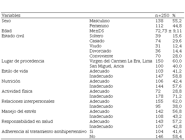De un total de 250 pacientes con HTA, el 55,2% fueron del sexo masculino y el 44,8% femenino, con una edad promedio de 72,73±9,11 años. El 29,6% manifestaron ser casados, seguido de un 28% de convivientes; a su vez, el 60% fueron del poblado La Era-Perú y el 40% de San Miguel-Chile (tabla 1).