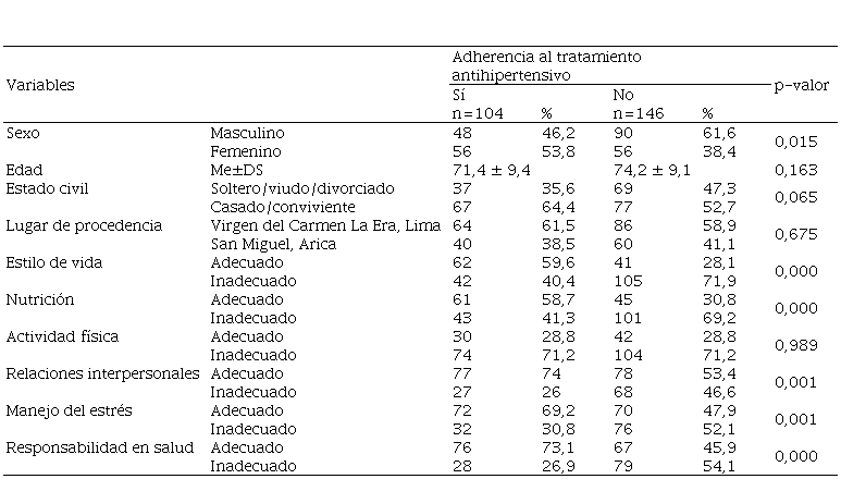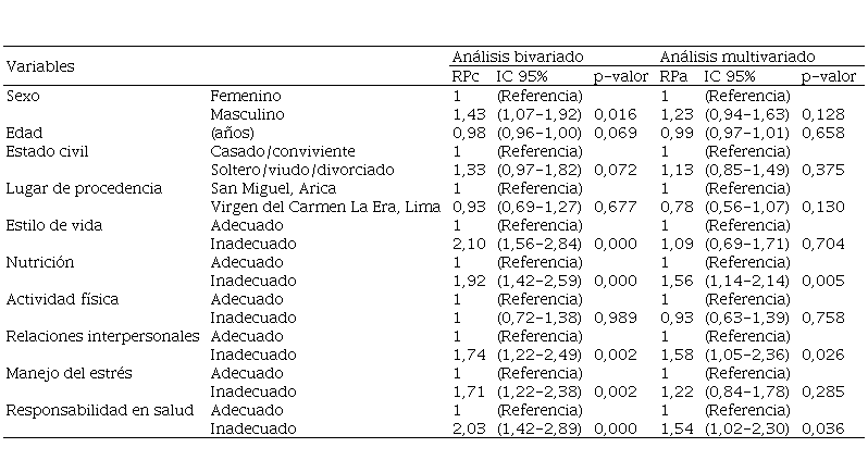 Methodology: Cross-sectional analytical study, made up of 250 hypertensive patients, 150 belonging to the La Era-Lima Health Center, Peru and 100 to the “Cardiovascular Health” Program of San Miguel-Arica, Chile, chosen through non-probabilistic sampling and for convenience. For data collection, the previously validated Lifestyle Profile questionnaire (FIFO-I) and the Morisky-Green scale were used. For the multivariate analysis, the robust Poisson regression of variance was used.