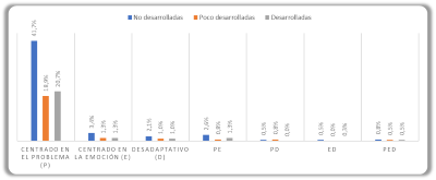 El 6% de los estudiantes 23 de 386 se ubican en el estilo de afrontamiento al estrés centrado en la emoción identifica el problema y si no la puede resolver busca ayuda apoyo social para fortalecer sus emociones, busca el lado positivo y el crecimiento personal frente a ese problema, acepta la realidad tal cual es, minimiza el dolor, los inconvenientes para afrontar situaciones y si consideran necesario acuden a la religión para el apoyo de las emociones t con ello enfrentar con hidalguía los retos que se presentan sin embargo al momento de una situación real 13 de los estudiantes no pueden poner en práctica lo antes mencionado , 10 de los estudiantes si desarrollan y ponen el práctica la solución de problemas reales y difícil de resolver, y el 4% se practica el estilo desadaptativo o evitativo, reforzando lo mencionado por Berdullas37. Algunos individuos cuentan con un amplio abanico de recursos –emocionales, cognitivos, conductuales– a la hora de afrontar las situaciones problemáticas o las experiencias vitales estresantes en el estudio o en el trabajo, sin embargo, deficiencias importantes al tratar de resolver problemas cotidianos de la vida diaria en familia o en ámbito familiar. Podemos afirmar que el estado emocional de los estudiantes universitarios es fundamental al momento de afrontar problemas sociales, cuando se presente algún problema laboral o de estudio ellos afrontan situaciones de estrés en este caso el Covid 19, Es preciso que este estudiante emocionalmente estable en los estudios y centros laborales manifestaron que cuando el problema ocurre centro del círculo familiar cercano no las pueden manejar debido a los sentimientos que representa la familia.
