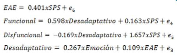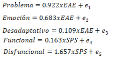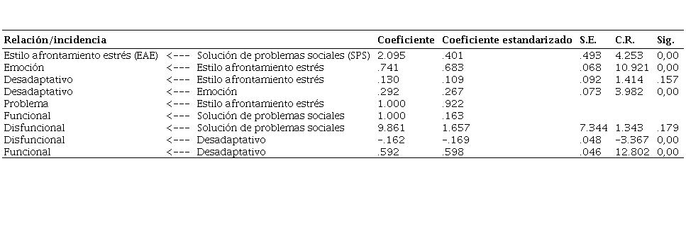 Del modelo estructural se puede afirmar que las habilidades de problemas sociales influyen en el 40% en los estilos de afrontamiento al estrés para que suceda ello el aporte de las habilidades disfuncionales en el 91%, los estudiantes universitarios definen problemas, generan alternativas, toman decisiones y pueden desarrollar un problema, identificación del problema, generación de alternativas, toma de decisiones, implementan y verifican la solución de manera práctica y las habilidades funcionales en el 9% conocimientos teóricos de los problemas sociales, manejo de emociones y conductas y comportamientos acorde al problema de investigación, los mencionados aportes hacen contribuyen para que el estilo centrado en el problema se afiance en 54 %, el manejo emocional en el 40% y el estilo desadaptativo o evitativo en el 6%. Así mismo, el estilo desadaptativo de afrontamiento al estrés incide en 60% de manera positiva y significativa (0,598***) sobre la dimensión funcional de la solución de problemas sociales, el mismo estilo desadaptativo incide de manera negativa y significativa (-0,169***) sobre la dimensión disfuncional de la solución de problemas sociales. Del mismo modo, se encuentra un incidencia positiva y significativa (0.267) del estilo de afrontamiento centrado en la emoción sobre el estilo desadaptativo de afrontamiento al estrés.