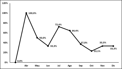 Un total de 145 pacientes se incluyeron en el estudio, 95 hombres y 50 mujeres, con una edad promedio 63.8±16.0 años. Entre ellos 6/145 pacientes fueron trasladados a otras instituciones por lo que los detalles del alta o muerte en el hospital se analizó en 139/145 (96%) pacientes. Del total de pacientes incluidos, a 79/145 (54.5%) se le prescribieron antibiótico durante la hospitalización y 66/145 (45.5%) no recibieron antibióticos. La figura 1 muestra el porcentaje de pacientes que recibieron antibióticos intrahospitalarios según el mes de ingreso a la institución. Con el curso del tiempo se observó una disminución progresiva en la prescripción de antibióticos en los pacientes ingresados con el diagnóstico clínico de COVID-19. Aproximadamente un tercio de los pacientes recibieron antibióticos en los últimos meses analizados.