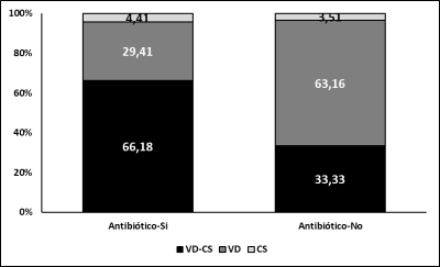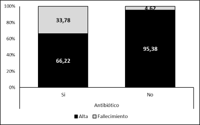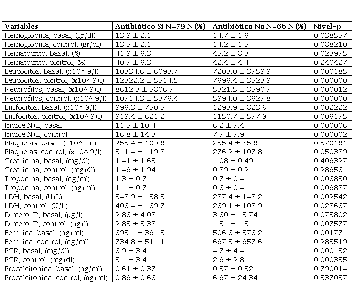 La Tabla 3 muestra los valores de algunas pruebas de laboratorio y marcadores inflamatorios de ingreso y control en los dos grupos de pacientes. El grupo de pacientes que requirió antibióticos tenían valores más elevados en las mediciones de ingreso y control del recuento total de leucocitos, neutrófilos e índice Neutrófilos/Linfocitos (N/L) y valores más bajos de hemoglobina, hematocrito y recuento de linfocitos.