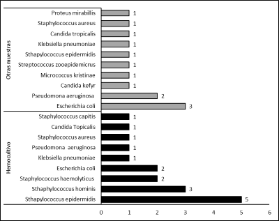 En un total de 52/145 pacientes (35%) se tomaron muestras para cualquier tipo de cultivo y 49/145 (33.8%) fueron hemocultivo. Del total de cultivos solo 19/52 (36.5%) fueron positivos. La figura 3 muestra los microorganismos aislados en los hemocultivos y otras muestras. Un total de 15 microorganismos fueros aislados en los hemocultivos, 5/15 fueron considerados patógenos (33.3%) y 10/15 contaminantes (66.7%). En los otros tipos de muestras se aislaron 9 microorganismos, 6/9 (66.7%) se consideraron patógenos y 3/9 (33.3%) contaminantes. En general la gran mayoría de los casos con crecimiento bacteriano fueron considerados como contaminados.