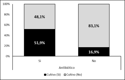 El porcentaje de pacientes con y sin cualquier tipo de cultivo bacteriano según uso de antibióticos se muestran en la figura 4. En aproximadamente la mitad de los pacientes que recibieron antibiótico se tomó algún tipo de muestra para cultivo (41/79) comparado con 17% (11/65) de los que no requirieron antibiótico. La proporción de cultivos positivos y negativos fue similar entre los grupos. Casi dos tercios de los pacientes que recibieron antibióticos tenían cultivos de cualquier muestra negativo y 70% hemocultivo negativo.