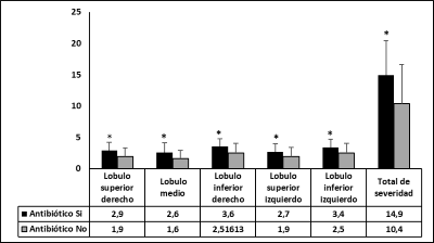 Las alteraciones cuantitativas y cualitativas del parénquima pulmonar en la TC de tórax de los pacientes con y sin requerimientos de antibióticos se muestran en la Figura 5 y 6. El puntaje de gravedad en cada uno de los lóbulos pulmonares y total fue significativamente mayor en los pacientes que requirieron antibióticos (figura 5). También se observó en este grupo una mayor proporción (45/68) de pacientes con presencia de lesiones combinadas de vidrio deslustrado más consolidados, comparados con aquellos que no requirieron antibióticos en los que más del 50% tenían solo lesiones de tipo vidrio deslustrado (36/57).