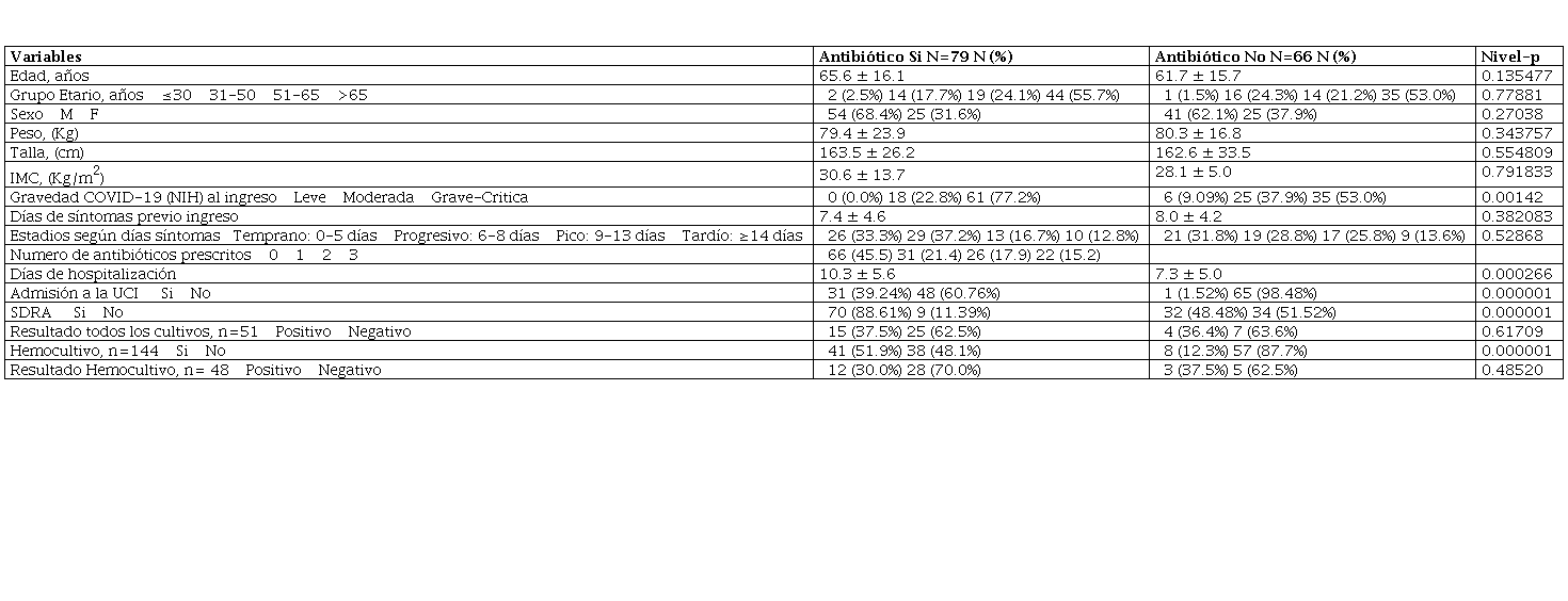 Resultados: Se incluyeron 145 pacientes, 95 hombres y 50 mujeres, con edad promedio 63.8±16.0 años. 79/145 (54.5%) pacientes recibieron antibióticos, 52/145 (35%) tuvieron muestras para cultivo y 49/145 (33.8%) fueron hemocultivo. Se aislaron bacterias patógenas en 7% de los pacientes. Los pacientes con antibiótico tenían mayor alteración de oxigenación, tomografía de tórax y marcadores inflamatorios, más ingreso a UCI, fallecimientos, y estancia hospitalaria prolongada.