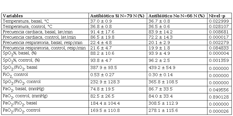 La tabla 2 muestra los resultados de los signos vitales y oxigenación de ingreso y control en los dos grupos de pacientes. El grupo de pacientes que requirió antibióticos tenían valores más altos de temperatura y niveles más bajos de SpO2%, SpO2/FiO2, PaO2 y PaO2/FiO2 al ingreso y en la evaluación control, así como mayor requerimiento de oxígeno (FiO2) comparado con aquellos que no recibieron antibióticos.