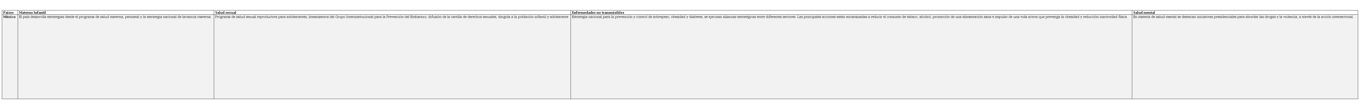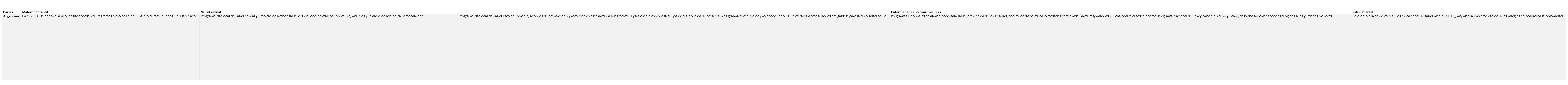 En la tabla 2, se pueden observar los principales programas y estrategias de los países objeto de estudio para el fortalecimiento de la estrategia de APS. Se describen las estrategias relacionadas con la salud materno infantil, salud sexual, enfermedades no transmisibles, las cuales se encuentran dentro de los principales componentes de la APS sugeridos desde Alma Atta28.