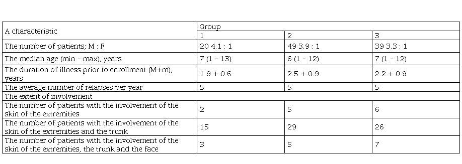 The study included pediatric patients (n=108) with microbial Eczema and the disease duration of more than six months who had been admitted to the Department of Dermatology of the Russian Children's Clinical Hospital. The inclusion criteria were as follows: an established diagnosis of ME; the absence of atopic dermatitis and/or atopic asthma; no less than two relapses within a year; written informed consent from the patients' parents for the participation in the study and for the use of personal data in scientific publications (Table 1).
