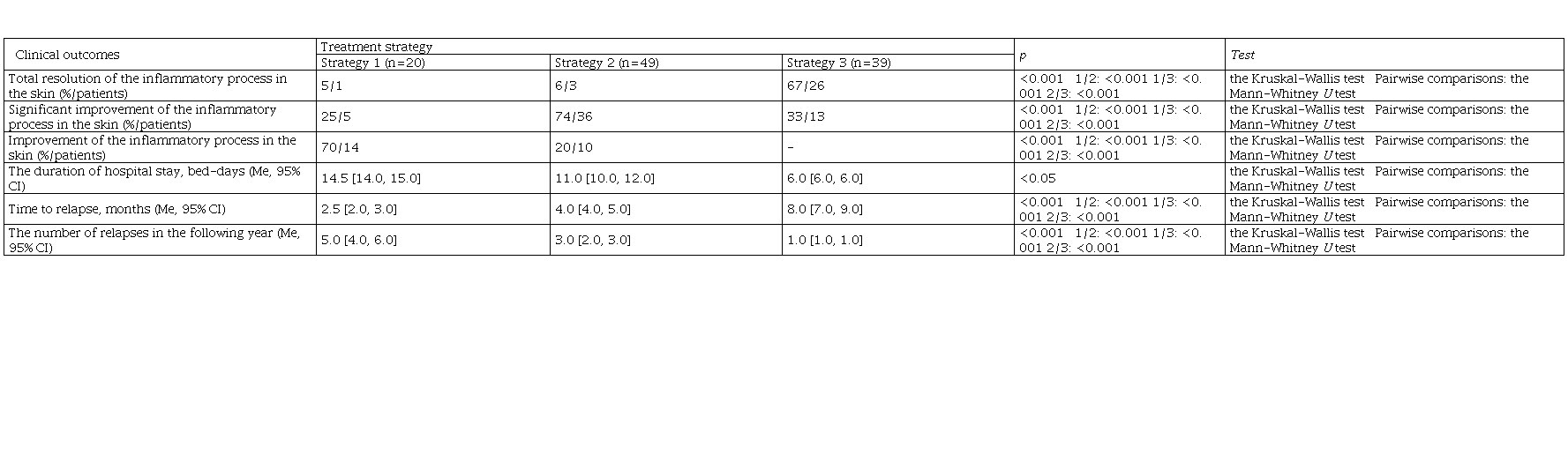 The effectiveness of treatment was evaluated by the time for the resolution of skin inflammation and the number of relapses during a 1-year follow-up (a relapse therapy was the same as that previously used in the study).