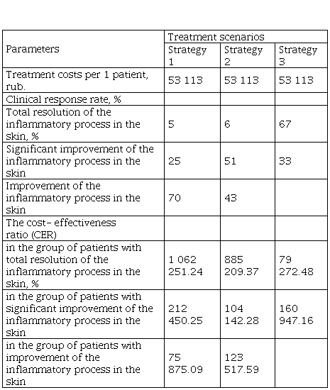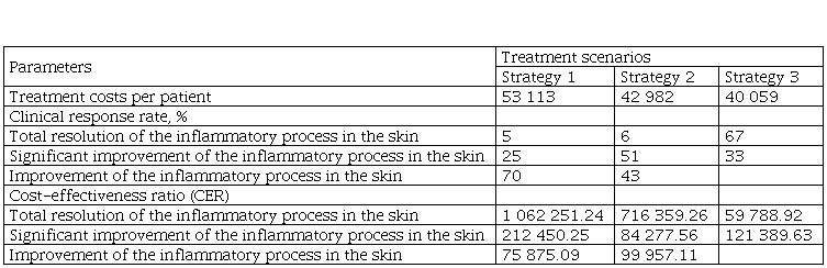 The obtained results showed that the costs per effectively treated patient who achieved total resolution of the inflammatory process in the skin were as follows: 1 062.25 thsd (Strategy 1), 716.35 thsd (Strategy 2), and 59.79 thsd (Strategy 3). In comparison with the standard treatment, the cost-effectiveness ratio is also lower when using combined treatment: 84.28 thsd (in combination with standard therapy and laser therapy) and 121.38 thsd (in combination with standard therapy and CAP).