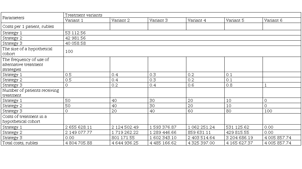 In order to assess the stability of the obtained results with respect to the change of the initial parameters, we carried out a sensitivity analysis: the evaluation of economic consequences with comparable treatment costs amounting to 53 112.56 rubles.