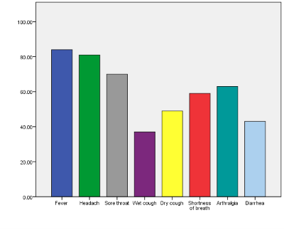 This study postulates an indication of the prevalence of the COVID-19 outbreak. The useful screening method for the diagnosis of COVID-19 is the symptoms. Most patients suffered from cough, fever, headache, and sore throat. Moreover, some patients suffered from diarrhea. There was an insignificant impact of the age of the patient on the severity of symptoms. Furthermore, the symptoms of COVID-19 in males were not noteworthy diverse from that in females. However, there was a significant correlation between fever and diarrhea, wet cough and shortness of breath, and wet cough and sore throat.