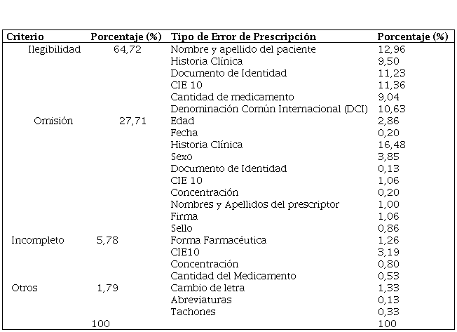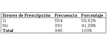 Conclusion: There is a high percentage of prescription errors in the analyzed prescriptions, which suggests that during the validation process carried out by the pharmaceutical staff it should be a key point to detect and correct any errors that put the patient at risk.