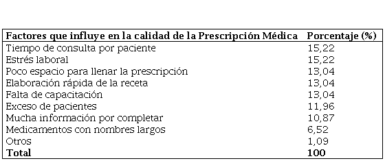 Los factores que influyen negativamente en la calidad de las prescripciones médicas se determinó mediante una encuesta previamente validada a 20 médicos prescriptores siendo el 40% médicos rurales, el 35% médicos generales y 25% médicos especialistas. Los resultados se muestran en la Tabla 3.