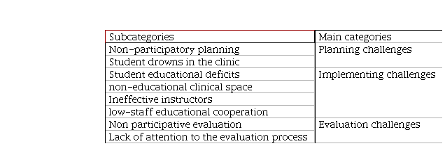Results: 626 in-vivo codes, 46 primary codes, 8 subcategories (lack of attention to the evaluation process, non-participative evaluation, low staff educational cooperation, ineffective instructors, non-educational clinical space, student educational deficits, student drown in the clinic, non-participatory planning), and 3 main categories (planning challenges, implementing challenges and evaluation challenges) were obtained.
