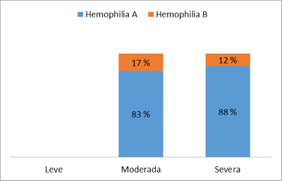 86% of patients from this study presented HA and 14% HB, these findings are in agreement with those published by Sousa et al. in 201324 who conducted a study in the hematology center of Paraiba-Brazil. In addition, Stonebraker's study in 2011, on the prevalence of hemophilia worldwide, reported similar statistics to those found by this work. Similarly, the report situation of Hemophilia in Colombia published by the National Fund for high-cost diseases stated that HA represented 83.3% of hemophiliacs3,23,24.