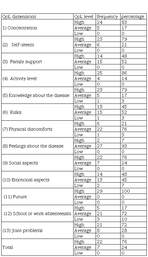 Table 1 summarizes the main data, showing that patients presented lower QoL perception on the following dimensions: knowledge about disease (5), physical discomforts (7), emotional aspects (10), and school or work absenteeism (12).