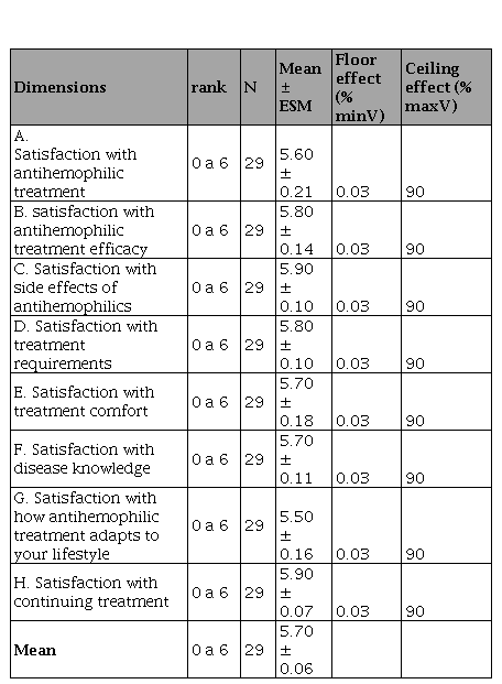 The lowest dimension was satisfaction with how antihemophilic treatment adapts to your lifestyle, which obtained an average value of 5.50±0.16 thus getting a ceiling effect of 90% patients in six and only 0.03% in zero.