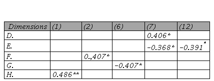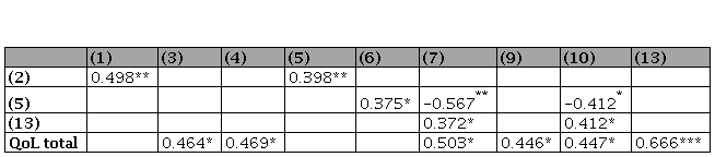 Table 3 presents results from bivariate Pearson correlations between dimension data obtained from the QoLHMex test. Each dimension was assigned a number from 1 to 13.